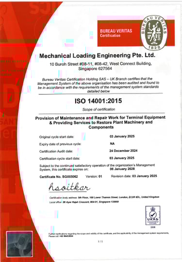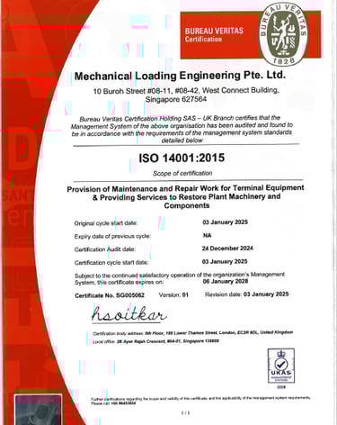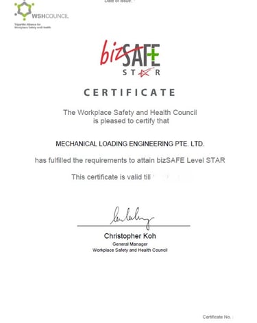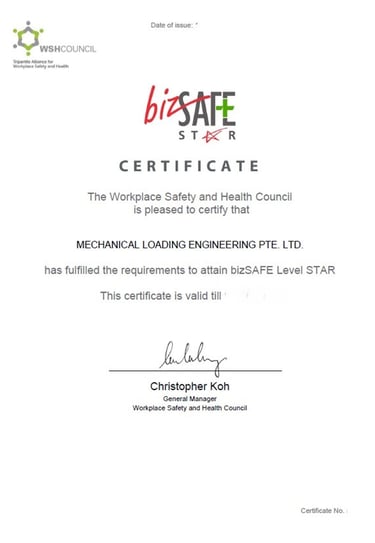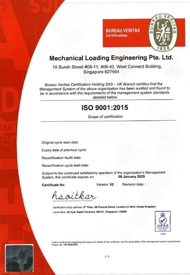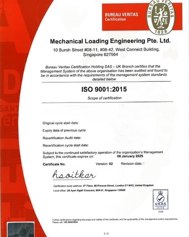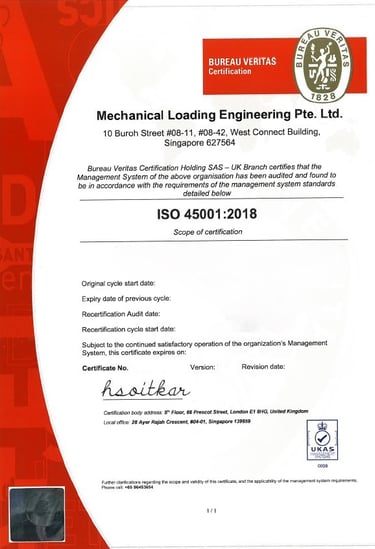 Mechanical Loading Engineering Pte. Ltd. takes great pride in being awarded ISO 9001 for quality management, ISO 14001 for Environmental Management Systems, ISO 45001 for occupational health and safety, and BizSafe Star certification.